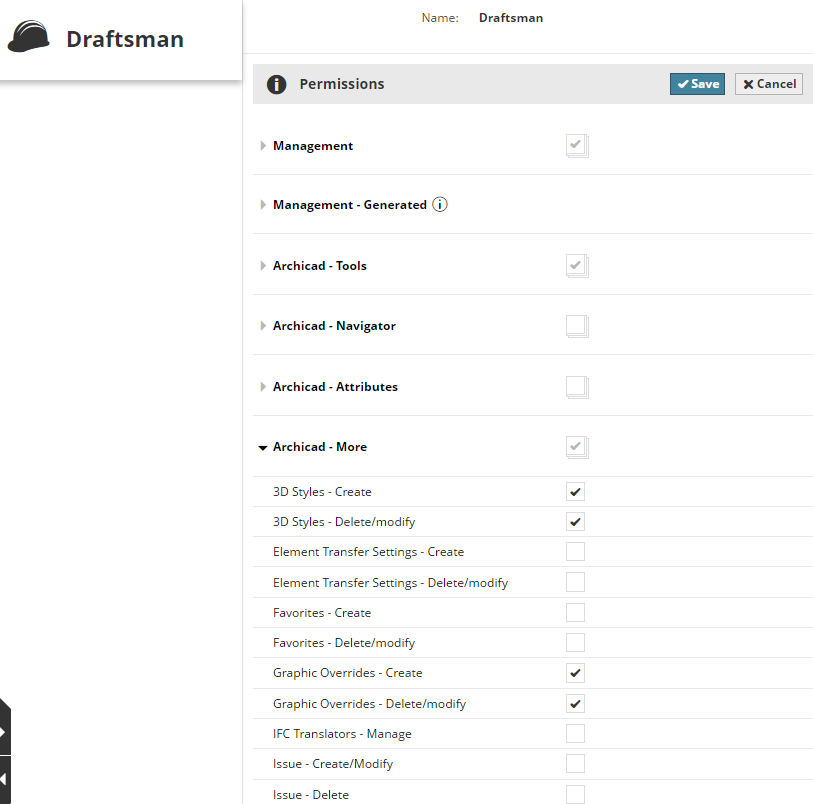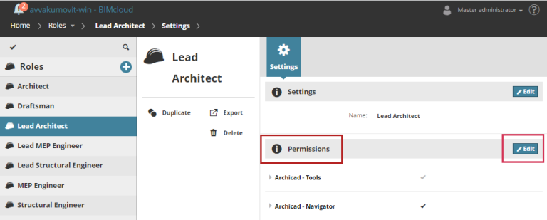 Roles in BIMcloud are a set of permissions that describe what the owner of the role can do with specific element types or data types. Customised Roles can be created and Edited when logged into the BIMcloud Manager as the Admin User.