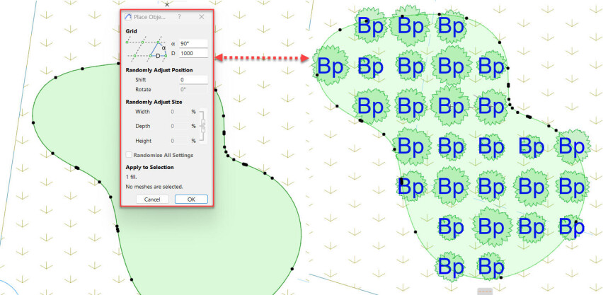 The first feature allows you to quickly place Plants based on a selected fill area with a set of desired plant objects and settings.