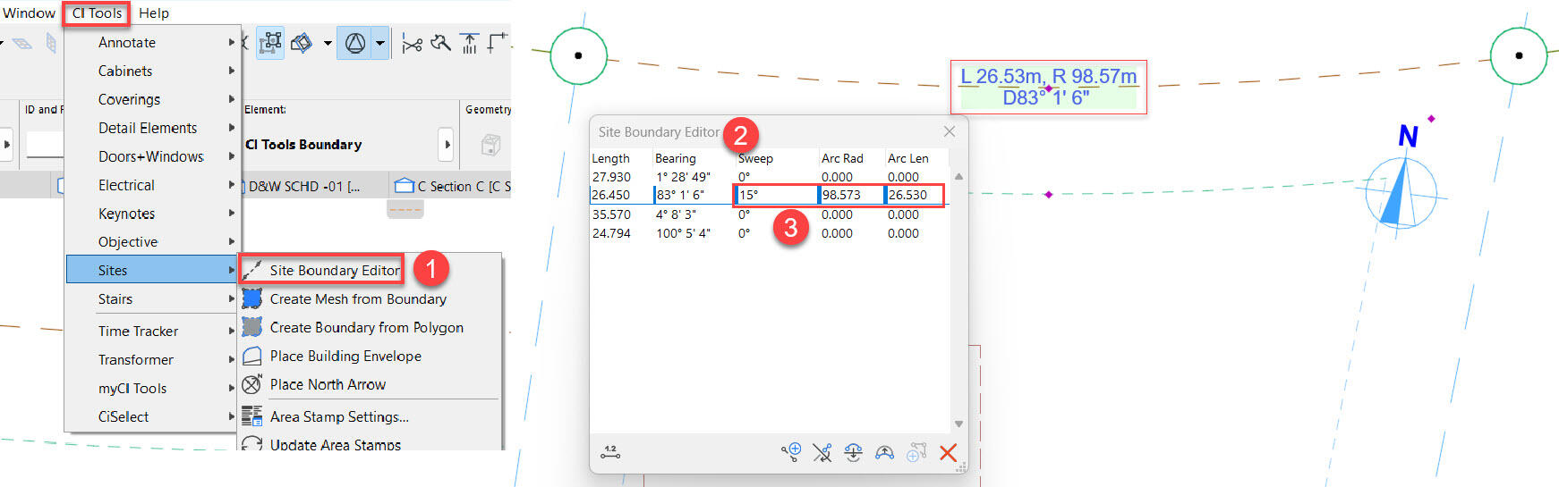 Ci Site Tool allows to create a Curved Boundary in the Site Boundary Editor – select a specific boundary that you need to modify, change the following parameters – Sweep < Arc Radius < Arc Length