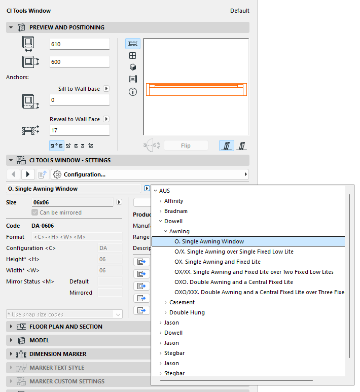 The Ci Window Tool offers a selected range of Window manufacturers. Whilst the standard sizes can be entirely customized, snap sizes can also be set and updated based on market availability.