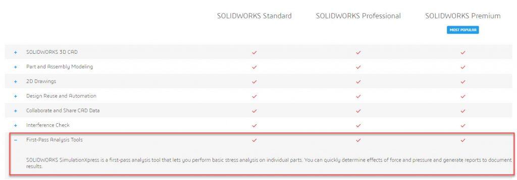 SolidWorks provides an entry-level stage design verification tool called SimulationXpresscomes with SolidWorks Standard, Professional and Premium Licenses. With SimulationXpress initial design validation for a part can be performed.