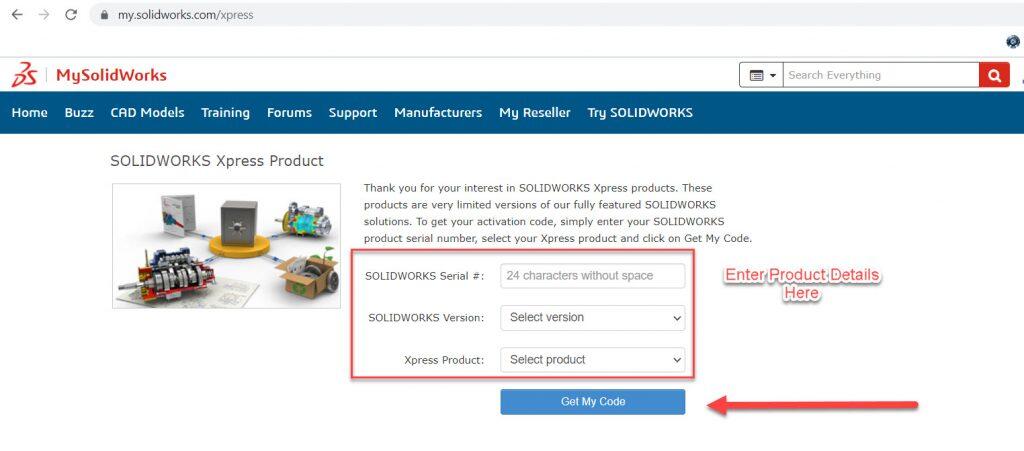 After logging into MySolidWorks.com/Xpress, enter the SolidWorks serial number, version, and the Xpress product required for activation. Click “Get My Code”.