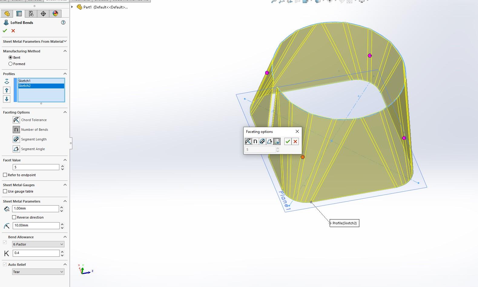 You can see with the Property Manager and the resulting preview that we have fewer options and a Message about the difference between a Bent and Formed Lofted Bend.