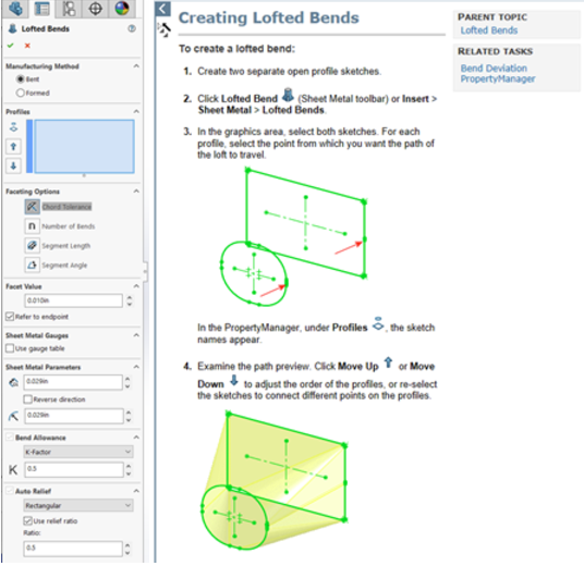 When we look at the Property Manager for Lofted Bends we are presented with quite a few options. Typically, when I want to know more about the feature that I am working on and what it can do for me I hit the? mark in the upper right. In the case of Lofted Bends, it takes me to a general help page for Lofted Bends telling us the basics of how to build a part with Lofted Bends.