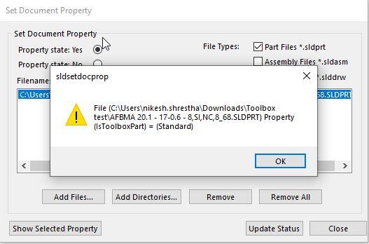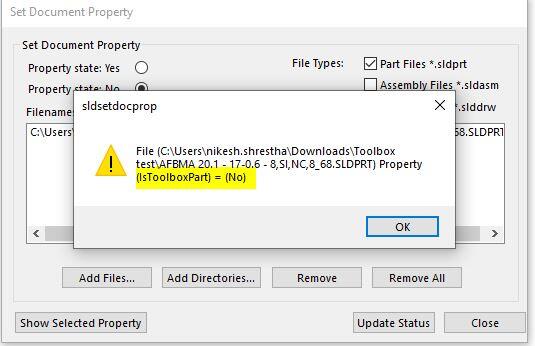 Step5: Now, set Property State to “ No” and click “Update Status” and click “Show selected Property to check the status. Also in the Assembly file you will not see toolbox icon in the Feature Manager tree anymore.