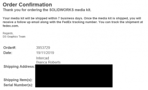 After successful completion of the form you will get an email from SolidWorks@dsgraphics.com confirming that they will ship your requested media kit.