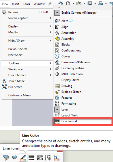 Also on the Line format toolbar, you will find the Color display mode. This will switch between the line format colors/layer colors and the system option colors.