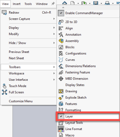 The toolbar indicates which layer is activated so any new entity added will be in this color.