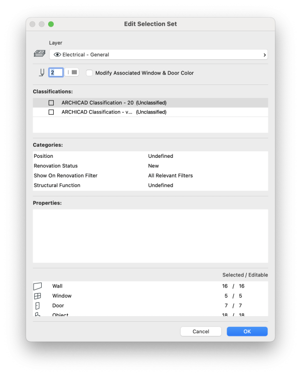I can imagine there have been times when you would like to change multiple elements from one layer to another, modify their renovation status or any other setting they have in common, and you end up doing it, first one type and then the other, creating a high time-consuming operation. Well for your fortune there is a feature in Archicad that allows to change some common settings across multiple different elements type. i.e changing the Layer to walls, slabs, beams and column just in one click. This feature is called Edit Selection Set, and you can find it just right next to the Eye Dropper tool or in the menu Edit > Elements Settings > Edit Selection Set