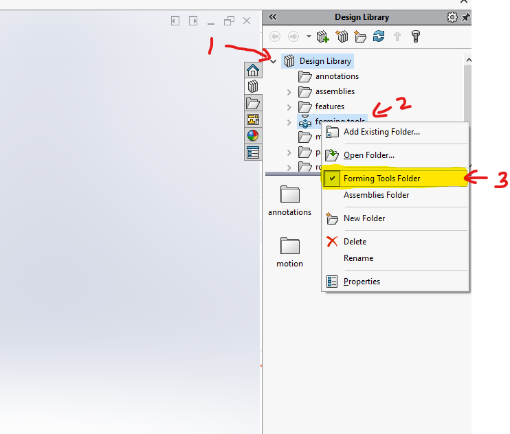 The point is that SolidWorks should know that this file is actually a forming tool so it can be used for that purpose. If we right-click on the “Louvers” folder under Design Library, there is an option called “Forming Tools Folder”.