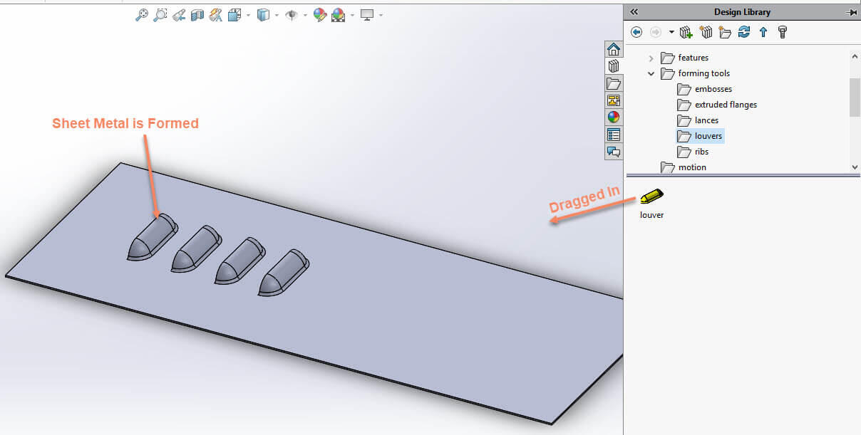 SolidWorks Forming Tools are found in the Design Library and are used to form sheet metal parts. In the following image, you can see how a forming tool is dragged from the Design Library onto the sheet metal model to form the part.