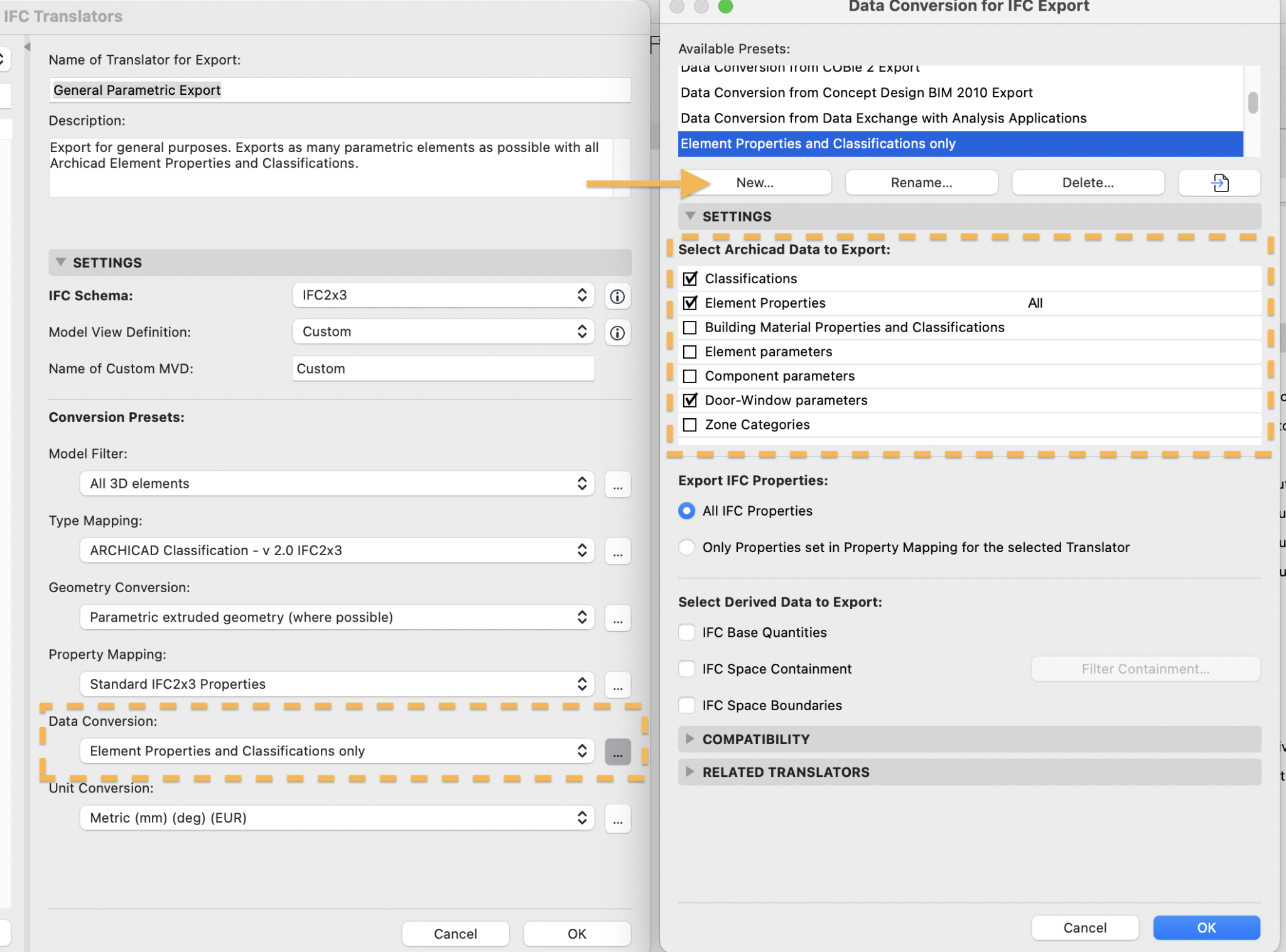 To ensure a good BIM workflow, is important to understand how a Translator is built. Archicad’s template already contains many preset Translators for you to use out of the box. The translator is composed of Conversion Presets, such as “Data Conversion”, in which the user can determine which data will be exported and which data is not relevant for that IFC export.