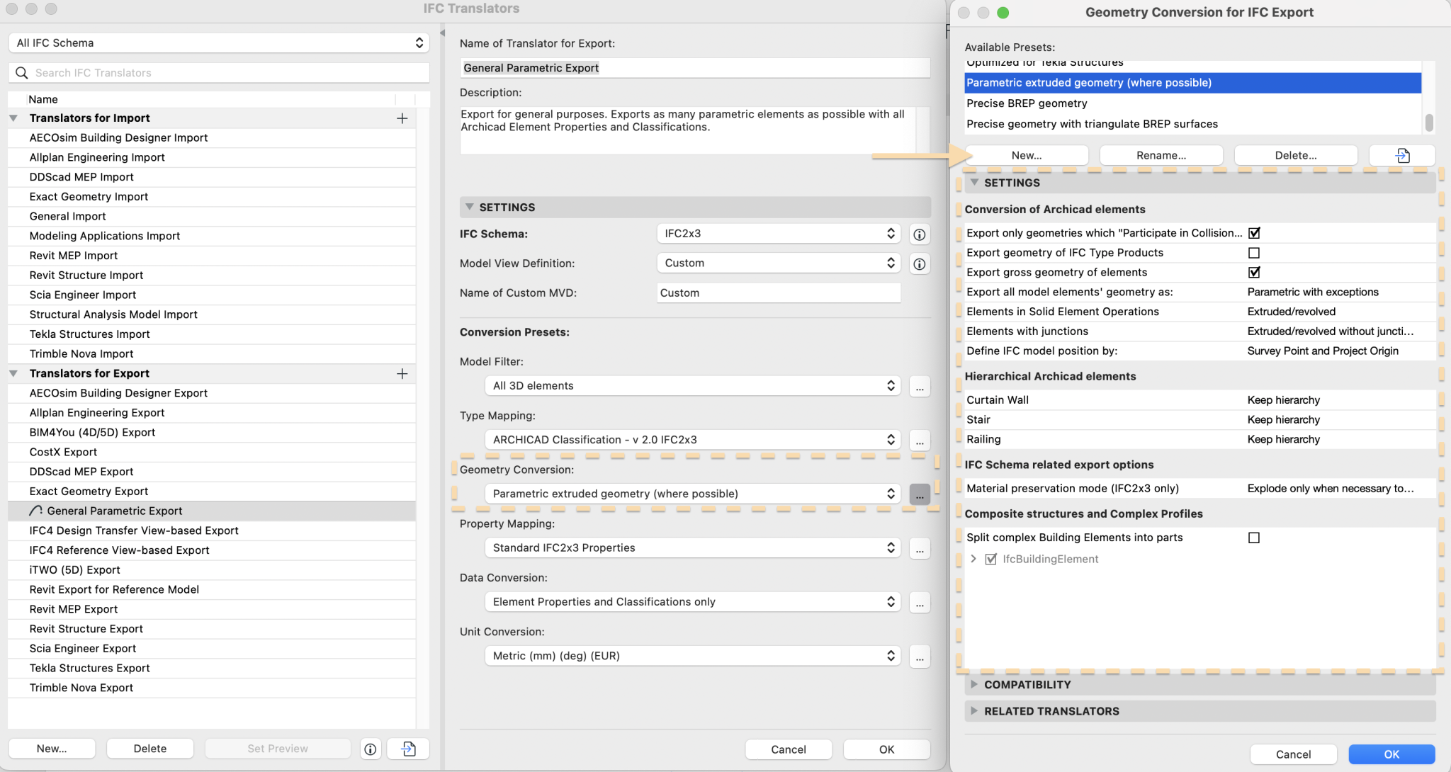 If the user’s goal is to import this IFC into another Parametric Software and to be able to make Parametric Changes, then it is worth exploring the Parametric Extruded Geometry Method. When editing, remember to always create a New Preset, so the other Translators are not affected by the changes: