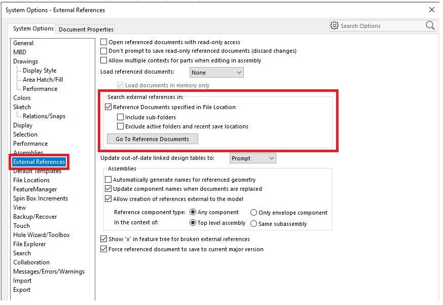 However, by adding path in Reference Documents, it also makes SolidWorks to search through those path whenever opens a file with reference document(s)/external reference(s). This will slow down the file opening time, especially when you are opening large assemblies/drawings and there are many files sitting under the Reference Document path.