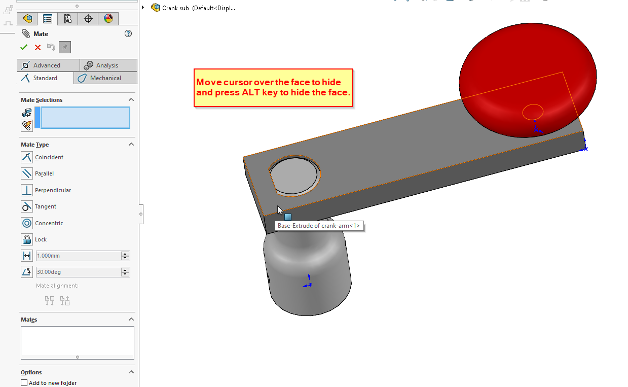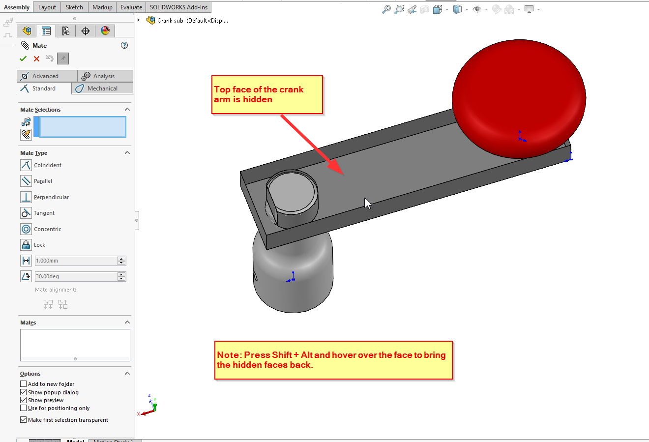 There are several ways to select hidden faces when adding or deleting mates. One option could be using the Alt Key to hide one or more faces and provide access to selected hidden faces.