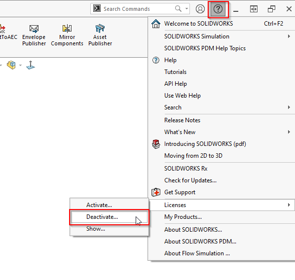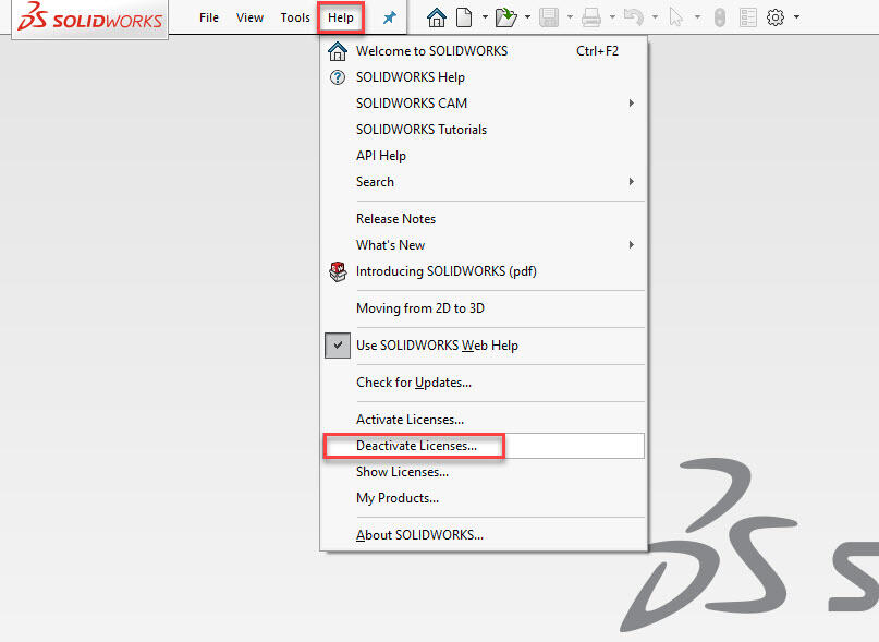 Go to the “Help” menu and select “Deactivate licenses”. In SolidWorks 2020 SP2 and earlier the menu is seen below.