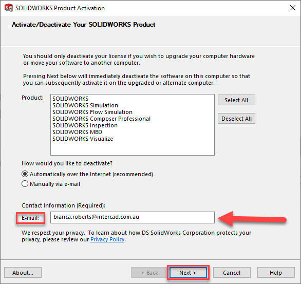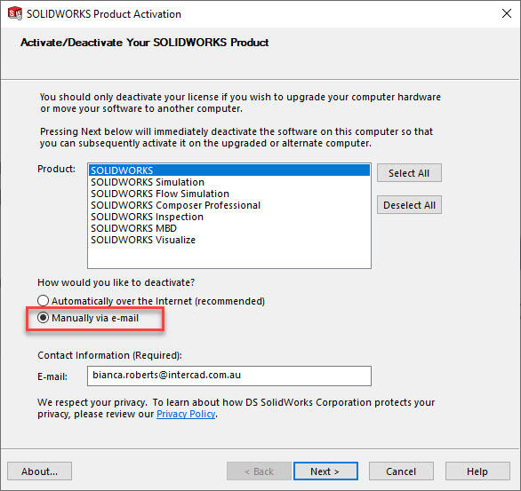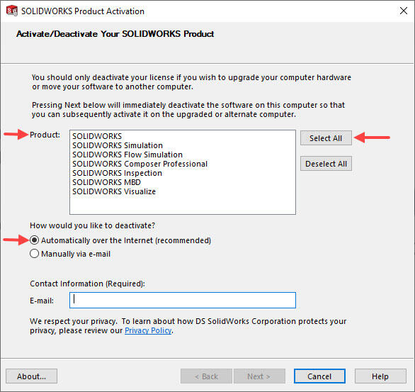 After selecting deactivate the SolidWorks product activation window appears. Select the product to release or use the “Select All” to remove all licenses off the machine. If the machine is connected to the internet we recommend using the “Automatically over the internet” method.