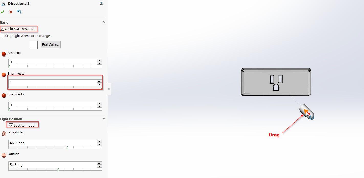 - Take Directional Light, for example; You can drag it to the desired location, set the Brightness, select if it will lock to the model.