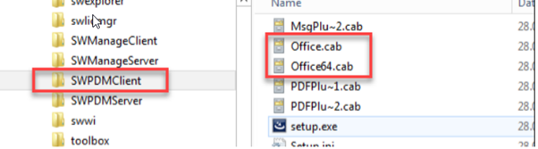 3) Open Office.cab for 32-bit Office. Extract epdmlib.dll and office.dll into the SolidWorks PDM 32-bit program folder location (c:\Program Files (x86)\SolidWorks PDM). OR, Open Office64.cab for 64-bit Office. Extract epdmlib.dll1 and office.dll1 into the Enterprise PDM install folder (c:\Program Files\SolidWorks Enterprise PDM) and rename the files to epdmlib.dll and office.dll.