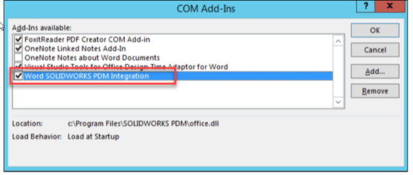 8. Make sure the SolidWorks PDM integration add-in is listed and enabled. If it is not listed, try starting the Office application using the “run as administrator” option, then use the Add… option in the COM Add-Ins dialog to locate and load the office.dll file.