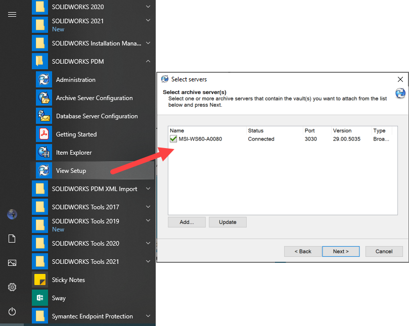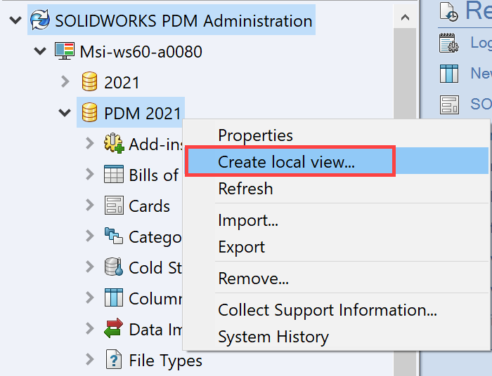 The Local Vault View can be added from PDM Admin or from the Windows Start menu. In PDM Admin, right-click on the vault and select Create Local Vault View.