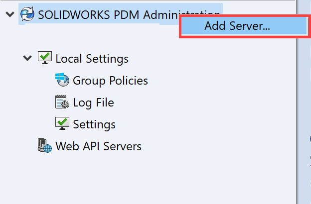 After installing PDM client > access the PDM admin tool > RMB ‘Add Server’