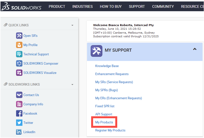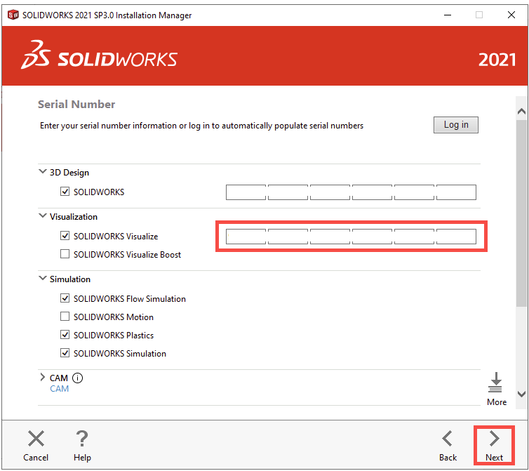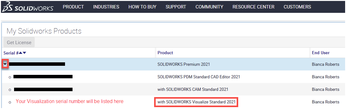 Click the arrow next to your SolidWorks product to expand the associated licenses and find you SolidWorks Visualize serial number