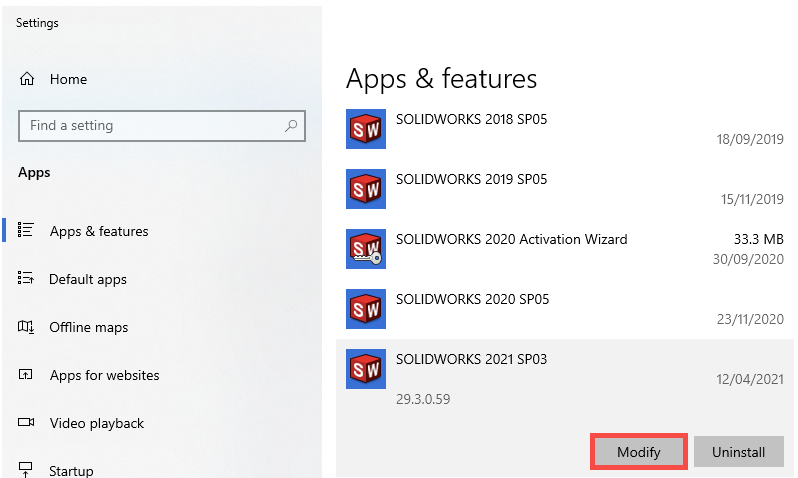 To install SolidWorks Visualise after having installed SolidWorks go to your Windows settings “Apps & features” and click modify