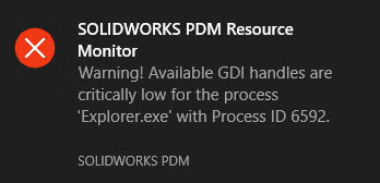 SolidWorks PDM Resource Monitor Warning that the available GDI handles are critically low for Explorer.exe