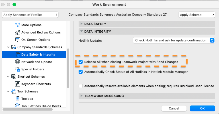 To make sure all elements are released when closing your teamwork file, you can go to your Work Environment Settings > Company Standards Schemes> Data Integrity and choose “Release All when closing Teamwork Project with Send Changes”: