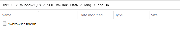 Make sure the lang\English folder is inside the SolidWorks data, and the English folder contains the sldedb file. As per default installation, the path will be defined as C:\SolidWorks Data, hence the database file will be created under the path C:\SolidWorks Data\lang\english\swbrowser.sldedb. If the error continues to appear, check, if the sldedb file is present in the desired location. Also, try modifying the path, using “…” button.