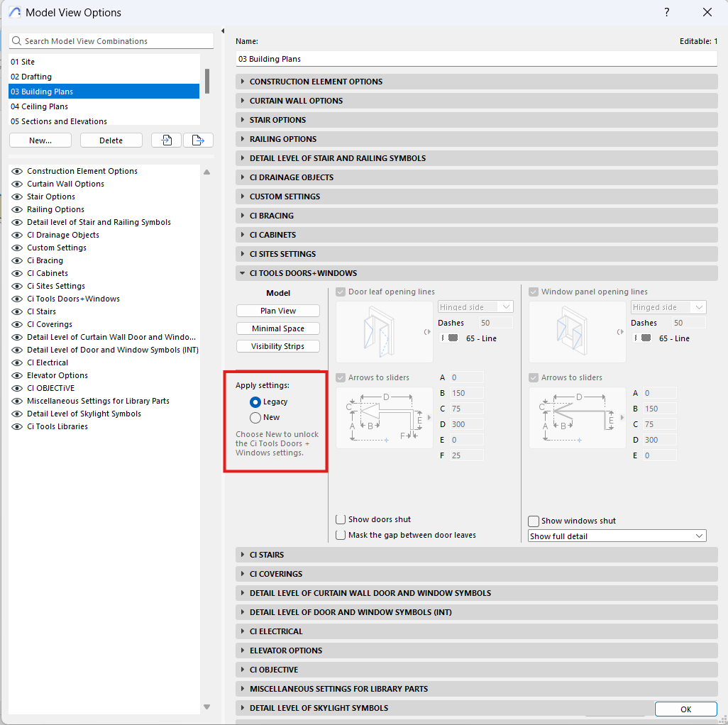 The new settings for Ci Door & Window in the Model View Option can be unlocked by switching the settings from Legacy to New with more enhanced options for Plan View and also Model Views.