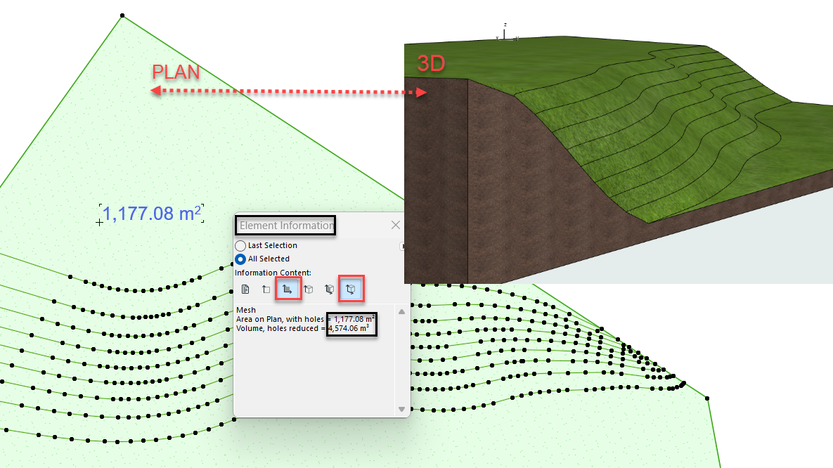 This is also a handy way to extract some initial information in Cut and Fill earthwork calculations (for example Existing Site Mesh and Proposed Site mesh situations) in Site Planning.