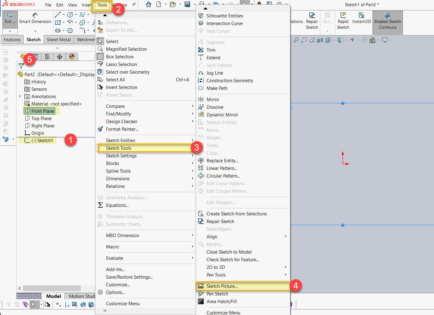 To insert a sketch picture, select open sketch, once you are in open sketch then select Tools > Sketch Tools > Sketch picture . As shown in the below image: