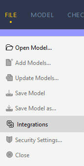 - Open Solibri and select Integrations from the menu on the left. If you already have Solibri open, click File > Integrations: