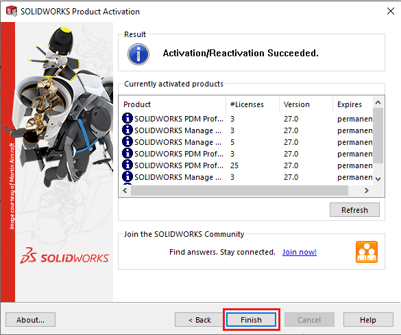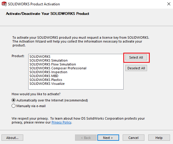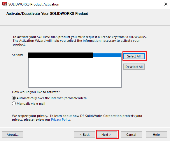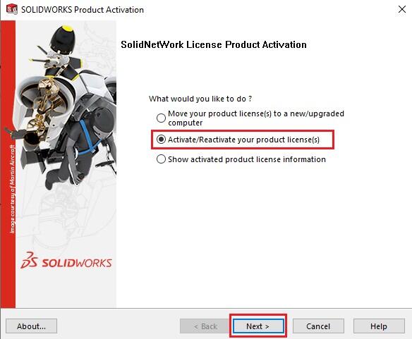 Select the Activate/Reactivate your product license(s) option and click through until you get to the Activate/Deactivate Your SolidWorks Product Screen