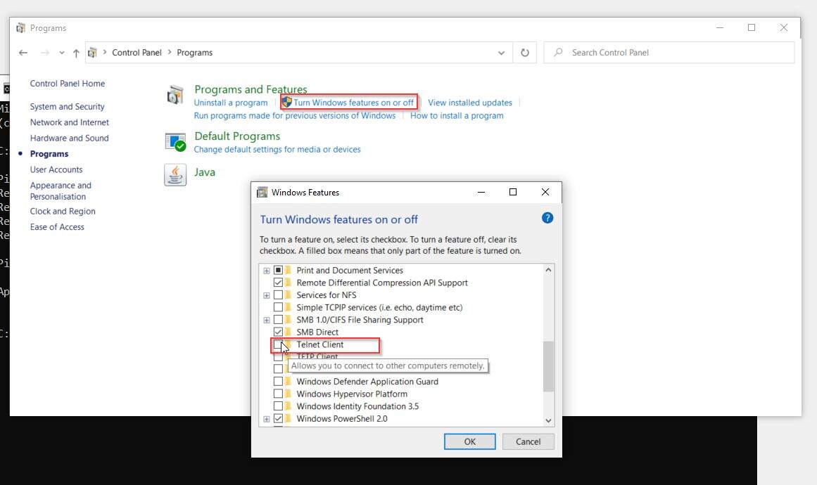 - Select Telnet Client and click ok.