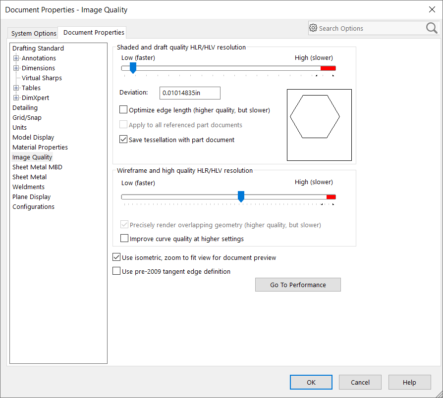 Note that changing the display properties under Tools > Options > Document Properties > Image Quality certainly helped but didn’t have a significant result on file size of the part. And using Display States with plain appearances didn’t make a lot of difference to the file size either.