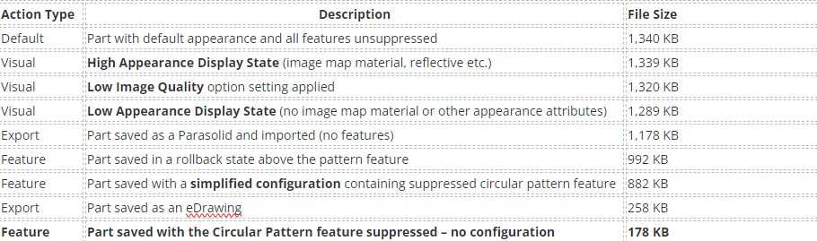 As you can see from the table of results saving a simplified version of the part with the Circular Pattern feature suppressed produced the smallest file size on disk. And combining that version with the other visual properties would likely further reduce the file size.
