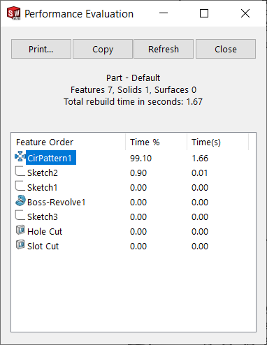 Actually the load time for the part from a local drive is pretty quick but when checking the performance evaluation of the part from Tools > Evaluate > Performance Evaluation you can see that the Circular Pattern feature requires over 99% of the rebuild time and is likely the reason for the part’s file size being over 1 MB: