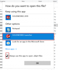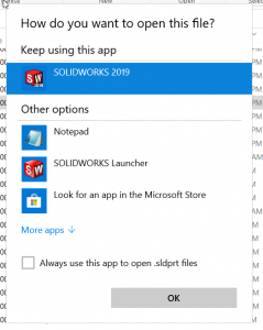 - Check if the default app is chosen correctly for SolidWorks files in Windows File Explorer: