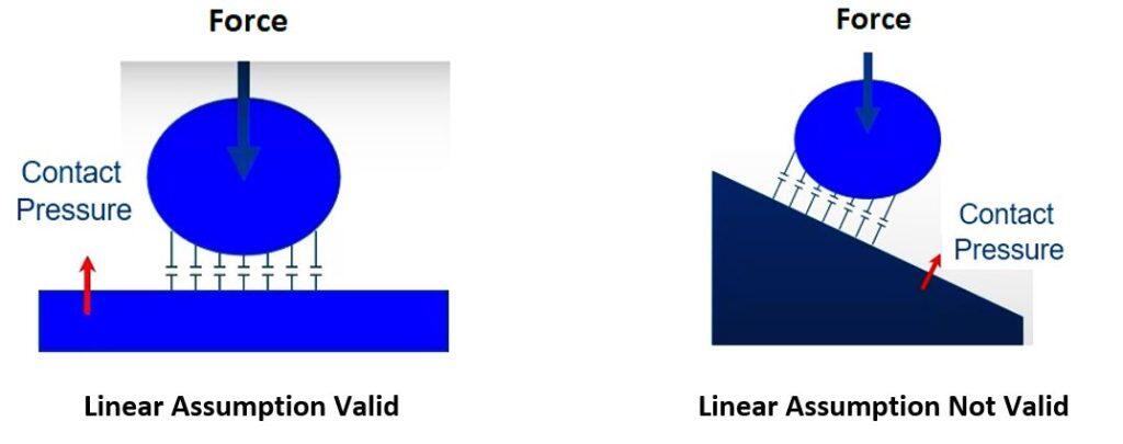 Basic no penetration contacts in a static study default to a “Linear” contact algorithm where certain assumptions are made to improve solution speed. These assumptions are: