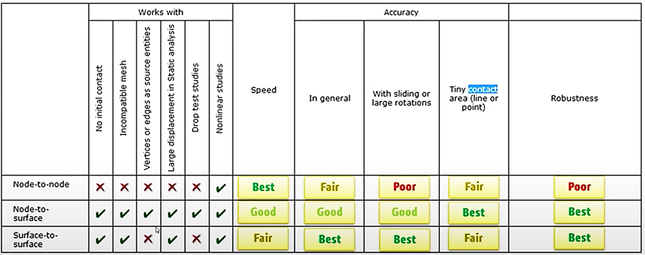 In general the surface – to – surface contact takes more time but is the best to use as it works for almost every scenario except where the contact area is extremely tiny such as contacting lines or points.